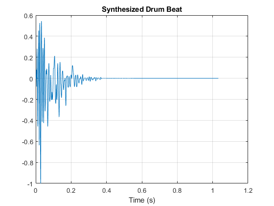 t = (0:length(drum)-1)/fs; plot(t,drum) grid on xlabel('Time (s)') title('Synthesized Drum Beat')