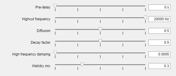 Создайте reverberator возразите и откройте его тюнер параметра пользовательский интерфейс. Этот пользовательский интерфейс позволяет вам настроить reverberator параметры как симуляция запускаются.