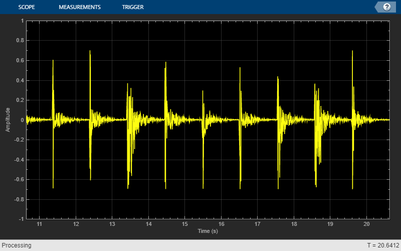 ts = timescope('SampleRate',fs, ... 'TimeSpanSource','Property', ... 'TimeSpanOverrunAction','Scroll', ... 'TimeSpan',10, ... 'BufferLength',10*256*64, ... 'ShowGrid',true, ... 'YLimits',[-1 1]);
