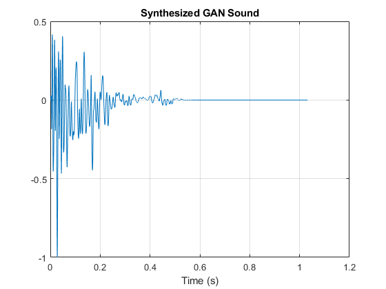 t = (0:length(myAudio)-1)/fs; plot(t,myAudio) grid on xlabel('Time (s)') title('Synthesized GAN Sound')