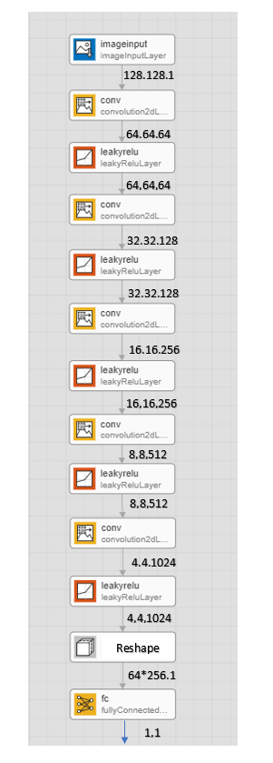 Создайте сеть, которая берет 128 128 изображения и выводит скалярный счет предсказания с помощью серии слоев свертки с текучими слоями ReLU, сопровождаемыми полносвязным слоем.
