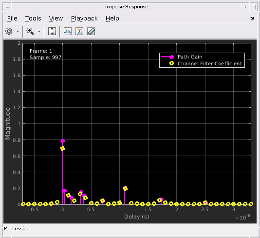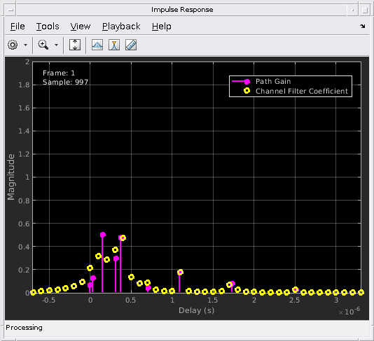 mimoChan2.NumSamples = nsdel;Сохраните усиление пути выход для непрерывного ответа канала при помощи mimoChan1 возразите и для прерывистых задержанных ответов канала при помощи mimoChan2 объект с начальными смещениями времени, обеспеченными как входные параметры.