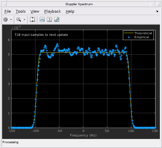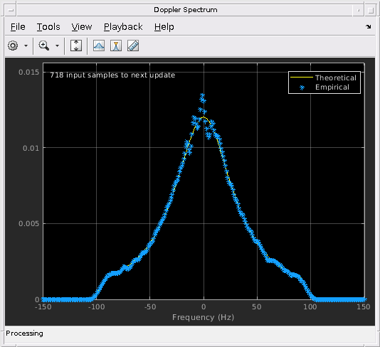 mimoChan = comm.MIMOChannel('SampleRate',1000, ... 'PathDelays',[0 0.002], ... 'AveragePathGains',[0 -3], ... 'MaximumDopplerShift',100, ... 'DopplerSpectrum',dp, ... 'ChannelFiltering',false, ... 'NumSamples',10000, ... 'Visualization','Doppler spectrum', ... 'PathsForDopplerDisplay',1);