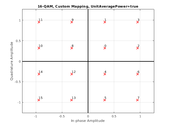 Сигнальное созвездие на передающую антенну Задайте созвездие, когда комплексный вектор-столбец, содержащий созвездие, указывает, с которым сопоставлены переданные биты. Настройка по умолчанию является созвездием QPSK со средней степенью |