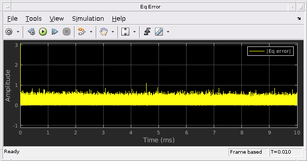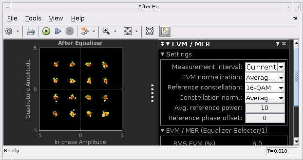 После Фильтра Rx и После того, как графики созвездия AGC показывают сигнал перед эквализацией. После того, как AGC показывает удар условий канала на переданном сигнале. После того, как график Eq показывает сигнал после эквализации. Сигнал, построенный в схеме созвездия после эквализации, показывает изменение качества сигнала на основе эффективности процесса эквализации. В течение симуляции, сигнальные созвездия, построенные перед эквализацией, отклоняются заметно от 16QAM сигнальное созвездие. После того, как созвездие Eq улучшается или ухудшается, когда сигнал ошибки эквалайзера варьируется. Eq error построенный в Диаграмме погрешностей Eq, указывает на плохую эквализацию в начале симуляции. Ошибка ухудшается, сначала затем улучшается, когда эквалайзер сходится.