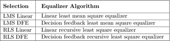 Адаптивные опции структуры эквалайзера линейны или обратная связь решения. Адаптивные опции алгоритма являются наименьшее количество среднего квадратичного (LMS), рекурсивным средним квадратичным (RMS) или постоянным алгоритмом модуля (CMA). Для справочного материала на адаптивных эквалайзерах смотрите Выбранные ссылки для Эквалайзеров.