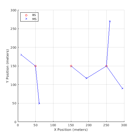 % Get all BS sector and MS positions BSPos = cell2mat({cfgLayout.Stations(1:numBSSect).Pos}); MSPos = cell2mat({cfgLayout.Stations(numBSSect+1:end).Pos}); scrsz = get(groot,'ScreenSize'); figSize = min(scrsz([3,4]))/2.3; figure('Position',[scrsz(3)*.5-figSize/2,scrsz(4)*.7-figSize/2,figSize,figSize]); hold on; grid on; hBS = plot(BSPos(1,:),BSPos(2,:),'or'); % Plot BS hMS = plot(MSPos(1,:),MSPos(2,:),'xb'); % Plot MS for linkIdx = 1:numLinks % Plot links pairStn = cfgLayout.Pairing(:,linkIdx); pairPos = cell2mat({cfgLayout.Stations(pairStn).Pos}); plot(pairPos(1,:),pairPos(2,:),'-b'); end xlim([0 300]); ylim([0 300]); xlabel('X Position (meters)'); ylabel('Y Position (meters)') legend([hBS, hMS],'BS','MS','location','northwest');