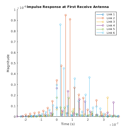 figure('Position',[scrsz(3)*.3-figSize/2,scrsz(4)*.25-figSize/2,figSize,figSize]); hold on; for linkIdx = 1:numLinks delay = chanInfo.ChannelFilterDelay(linkIdx); stem(((0:(frameLen-1))-delay)/chanInfo.SampleRate(linkIdx), ... abs(rxSig{linkIdx}(:,1))); end maxX = max((cell2mat(cellfun(@(x) find(abs(x) < 1e-8,1,'first'), ... rxSig.','UniformOutput',false)) - chanInfo.ChannelFilterDelay)./ ... chanInfo.SampleRate); minX = -max(chanInfo.ChannelFilterDelay./chanInfo.SampleRate); xlim([minX, maxX]); xlabel('Time (s)'); ylabel('Magnitude'); legend('Link 1','Link 2','Link 3','Link 4','Link 5','Link 6'); title('Impulse Response at First Receive Antenna');