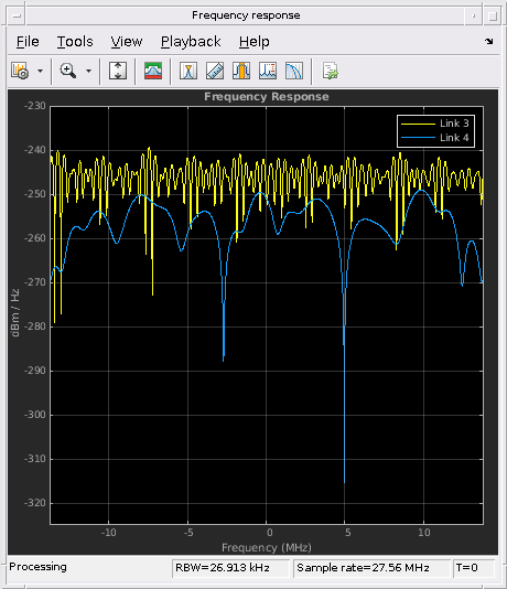 SA = dsp.SpectrumAnalyzer( ... 'Name', 'Frequency response', ... 'SpectrumType', 'Power density', ... 'SampleRate', chanInfo.SampleRate(3), ... 'Position', [scrsz(3)*.7-figSize/2,scrsz(4)*.25-figSize/2,figSize,figSize], ... 'Title', 'Frequency Response', ... 'ShowLegend', true, ... 'ChannelNames', {'Link 3','Link 4'}); SA(cell2mat(cellfun(@(x) x(:,1),rxSig(3:4,1)','UniformOutput',false)));