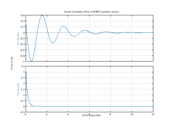 симулирует ответ начальных условий от h = initialplot(___,tFinal)t = 0 к итоговому времени t = tFinal. Задайте tFinal в модулях системного времени, заданных в TimeUnit свойство sys. Для систем дискретного времени с незаданным шагом расчета (Ts = -1), initialplot интерпретирует tFinal как количество интервалов выборки, чтобы симулировать.
