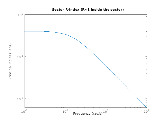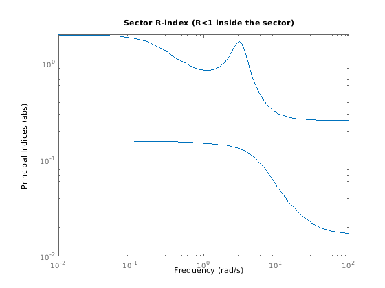 sectorplot( строит относительные индексы сектора для динамической системы H,Q)H и данная матрица сектора Q. Эти индексы измеряются тем, насколько связанному сектору удовлетворяют (индексируйте меньше чем 1), или нарушенный (индекс, больше, чем 1) на данной частоте. (Займитесь Границами Сектора и индексами Сектора для получения дополнительной информации о значении индекса сектора.) sectorplot автоматически выбирает частотный диапазон и число точек на основе динамики H.