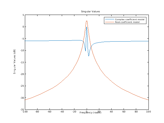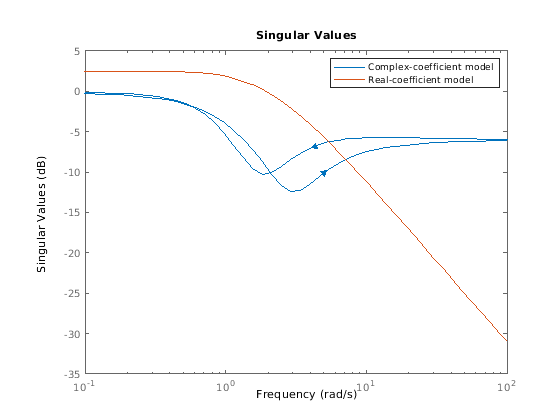 Регистрируйте шкалу частоты, график показывает две ветви, один для положительных частот и один для отрицательных частот. График также показывает стрелы, чтобы указать на направление увеличения значений частоты для каждой ветви. См. График Сингулярного значения Модели с Комплексными Коэффициентами.