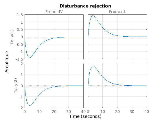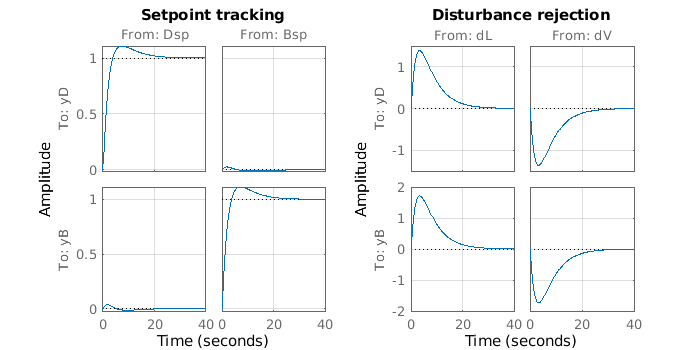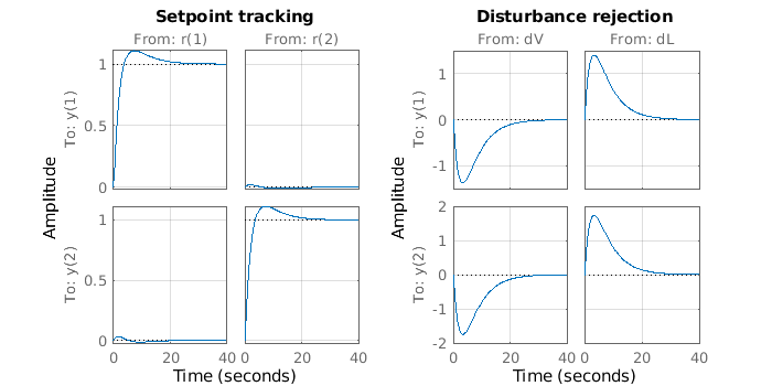 figure('Position',[0,0,700,350]) subplot(121) Ttrack = getIOTransfer(ST,'r','y'); step(Ttrack,40), grid, title('Setpoint tracking') subplot(122) Treject = getIOTransfer(ST,{'dV','dL'},'y'); step(Treject,40), grid, title('Disturbance rejection')