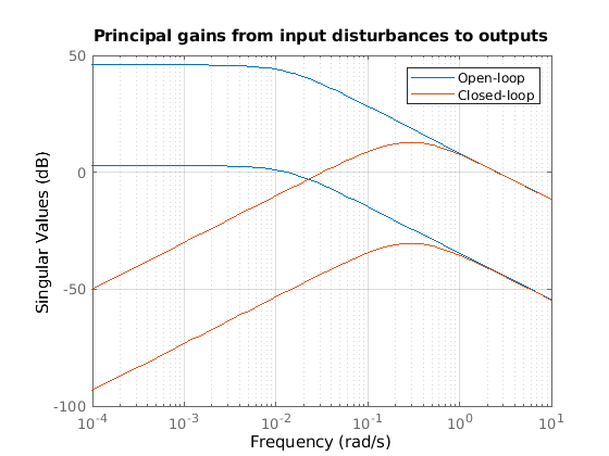 clf, sigma(G,Treject), grid title('Principal gains from input disturbances to outputs') legend('Open-loop','Closed-loop')
