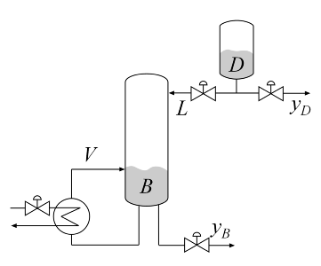 В так называемой настройке LV управляемые переменные являются концентрациями yD и yB из химикатов D (верхние части) и B (нижние части) и переменные, которыми управляют, являются отливом L и нагрузка кипятильника по пару V. Этот процесс показывает сильную связь и большие изменения установившегося усиления для некоторых комбинаций L и V. Для получения дополнительной информации смотрите Skogestad и Postlethwaite, Многомерное Управление с обратной связью.