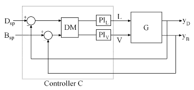 Чтобы достигнуть этих целей, мы используем архитектуру управления, показанную ниже. Эта архитектура состоит из статического разъединяющегося матричного DM последовательно с двумя ПИ-контроллерами для отлива L и нагрузка кипятильника по пару V.