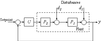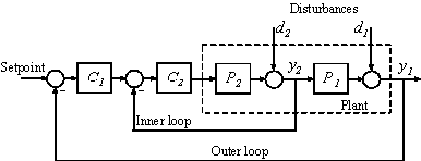 C1 контроллера во внешнем контуре является первичным контроллером, который регулирует первичную управляемую переменную y1 путем установки заданного значения внутреннего цикла. C2 контроллера во внутреннем цикле является вторичным контроллером, который отклоняет воздействие d2 локально, прежде чем это распространит к P1. Для системы каскадного регулирования, чтобы функционировать правильно, внутренний цикл должен ответить намного быстрее, чем внешний контур.