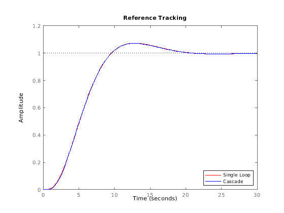 % single loop system for reference tracking sys1 = feedback(P*C,1); sys1.Name = 'Single Loop'; % cascade system for reference tracking sys2 = feedback(clsys*P1*C1,1); sys2.Name = 'Cascade'; % plot step response figure; step(sys1,'r',sys2,'b') legend('show','location','southeast') title('Reference Tracking')