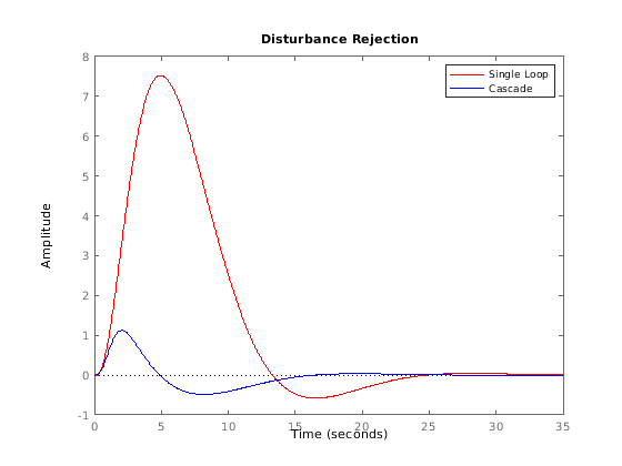 % single loop system for rejecting d2 sysd1 = feedback(P1,P2*C); sysd1.Name = 'Single Loop'; % cascade system for rejecting d2 sysd2 = P1/(1+P2*C2+P2*P1*C1*C2); sysd2.Name = 'Cascade'; % plot step response figure; step(sysd1,'r',sysd2,'b') legend('show') title('Disturbance Rejection')