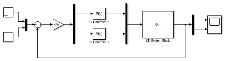 В этой модели Системой LTI, заданной в блоке, является Gm, модель передаточной функции с 2 входами, с 2 выходами сохранена в рабочем пространстве модели. Блок Mux комбинирует эти два контроллера выход в векторный сигнал для входа блока LTI System. Точно так же блок Demux разделяет векторный выход блока LTI System в два скалярных сигнала.