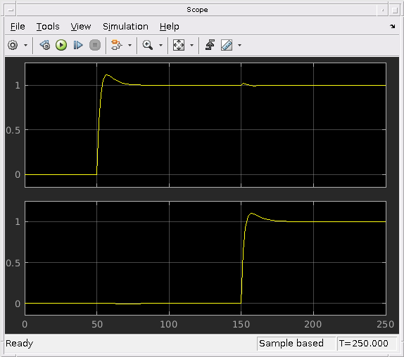 Этот пример симулирует отклик системы с обратной связью к t = 50 шагов с в первом входе и t = 150 шагов с во втором входе. Можно использовать системный блок LTI где угодно, вы хотите вставить систему LTI в модель Simulink.