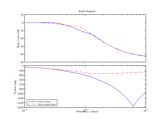 h = bodeoptions; h.PhaseMatching = 'on'; bodeplot(Tcl,'-b',Tnd1,'-.r',{.1,10},h); legend('Exact delay','First-Order Pade','Location','SouthWest');