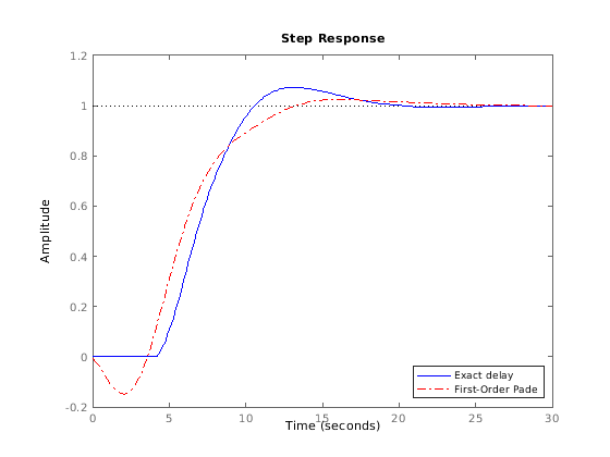 stepplot(Tcl,'-b',Tnd1,'-.r'); legend('Exact delay','First-Order Pade','Location','SouthEast');