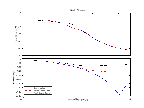 bodeplot(Tcl,'-b',Tnd3,'-.r',Tnd1,'--k',{.1,10},h); legend('Exact delay','Third-Order Pade','First-Order Pade',... 'Location','SouthWest');