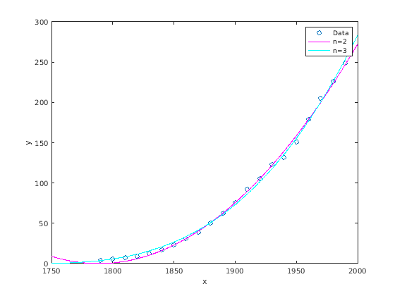 hold on plot(curve2,'m') plot(curve3,'c') legend('Data','n=2','n=3') hold off