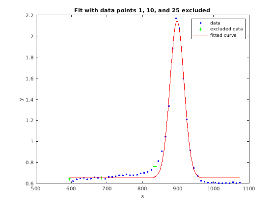 f1 = fit(x',y',gaussEqn,'Start', startPoints, 'Exclude', [1 10 25])