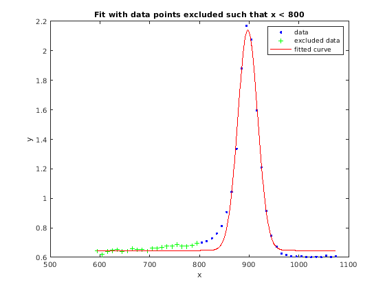 f2 = fit(x',y',gaussEqn,'Start', startPoints, 'Exclude', x < 800)