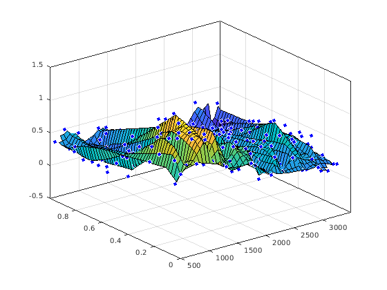 Загрузите некоторые данные и соответствуйте полиномиальной поверхности степени 2 в x и степень 3 в y. Постройте подгонку и данные.