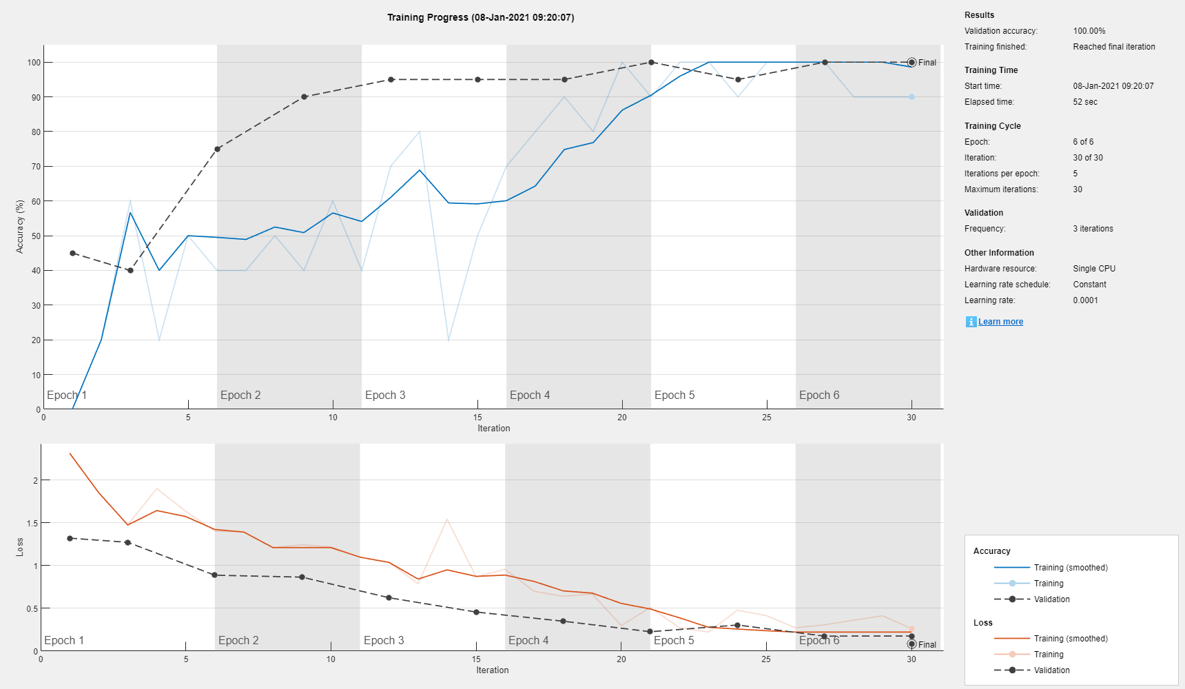 options = trainingOptions('sgdm', ... 'MiniBatchSize',10, ... 'MaxEpochs',6, ... 'InitialLearnRate',1e-4, ... 'Shuffle','every-epoch', ... 'ValidationData',augimdsValidation, ... 'ValidationFrequency',3, ... 'Verbose',false, ... 'Plots','training-progress');