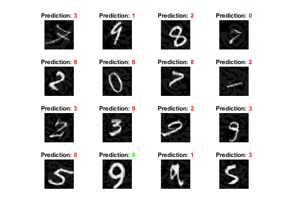 Исследуйте сетевую робастность путем генерации соперничающих примеров. Можно затем использовать быстрый метод знака градиента (FGSM) соперничающее обучение обучить сеть, устойчивую к соперничающим возмущениям.