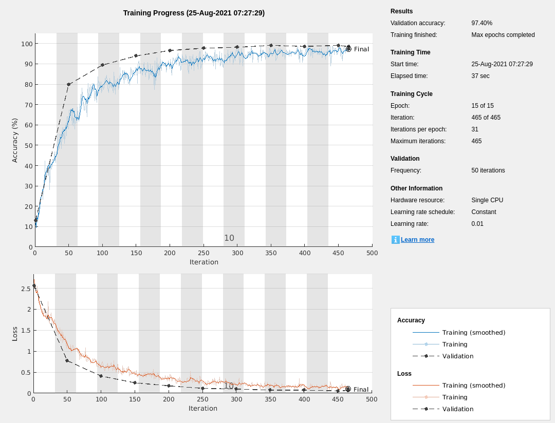 imageInputLayer нормирует изображения с помощью среднего значения увеличенных изображений, не среднего значения исходного набора данных. Это среднее значение вычисляется однажды в течение первой увеличенной эпохи. Все другие эпохи используют то же среднее значение, так, чтобы среднее изображение не изменялось во время обучения.