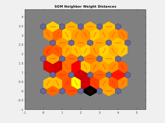 plotsomnd(net) строит SOM нейроны показывающего слоя как серо-синие закрашенные фигуры и их прямые соседние отношения с красными линиями. Соседние закрашенные фигуры окрашены от черного до желтого, чтобы показать, как близко вектор веса каждого нейрона его соседям.