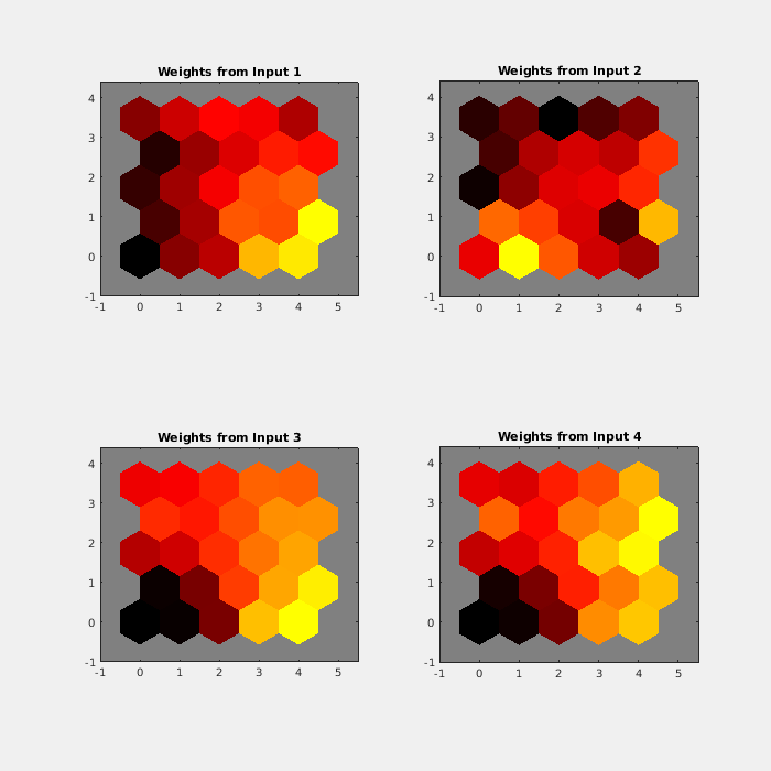 plotsomplanes(net) генерирует набор подграфиков. Каждый iподграфик th показывает веса от iвход th к нейронам слоя, с самыми отрицательными связями, показавшими черными, нулевыми связями, столь же красными, и самыми сильными положительными связями как желтый.