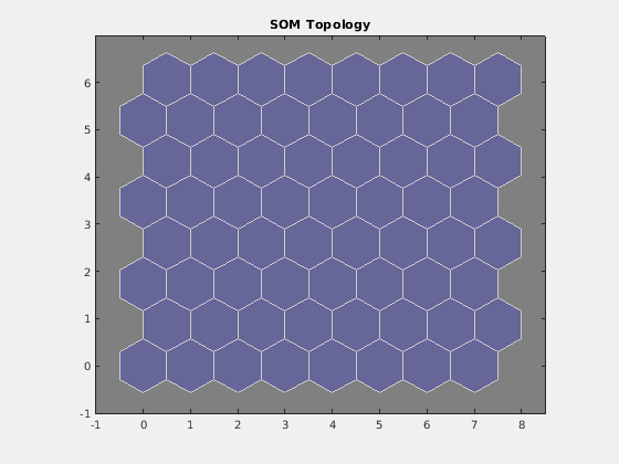 Figure SOM Topology (plotsomtop) contains an axes object. The axes object with title SOM Topology contains 64 objects of type patch.