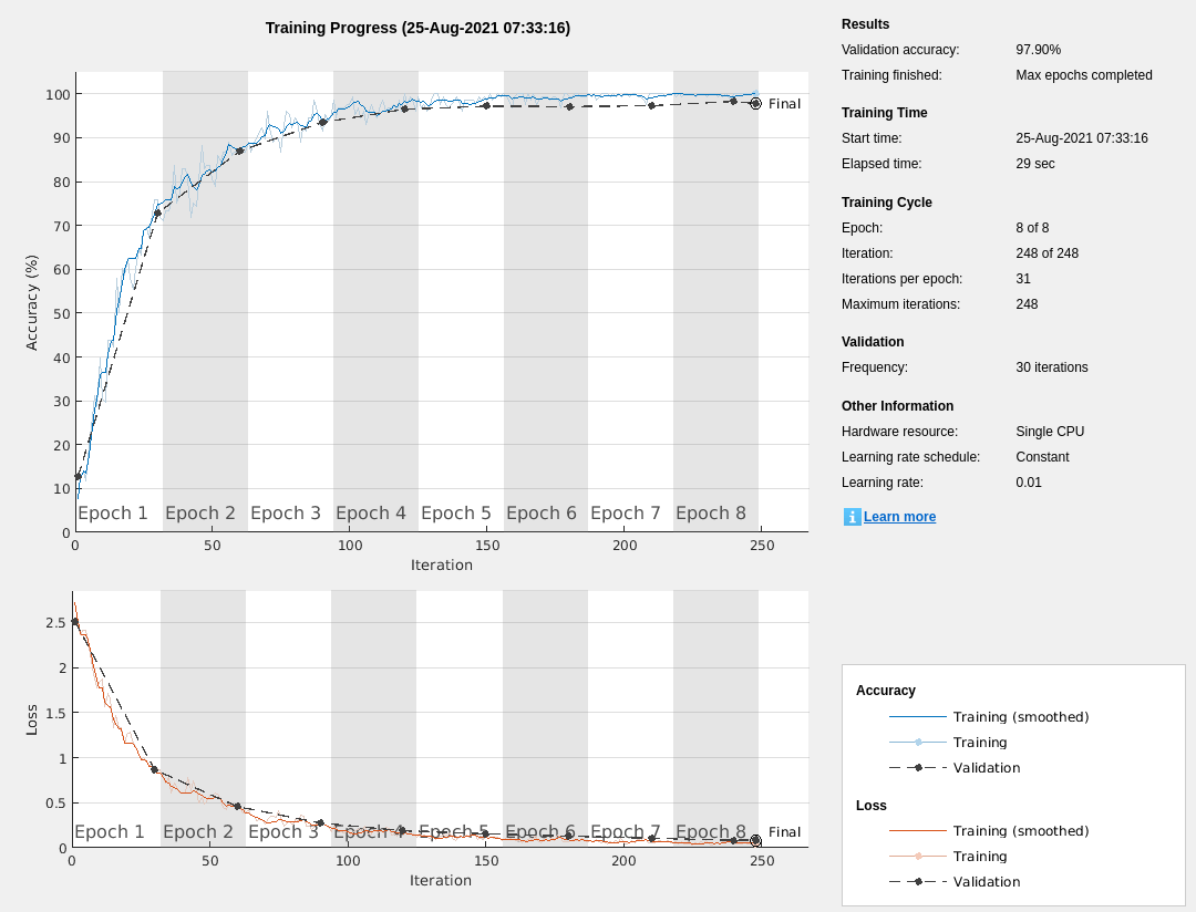Справа, просмотрите информацию в учебное время и настройки. Чтобы узнать больше об опциях обучения, смотрите Настроенные Параметры и Обучите Сверточную нейронную сеть.
