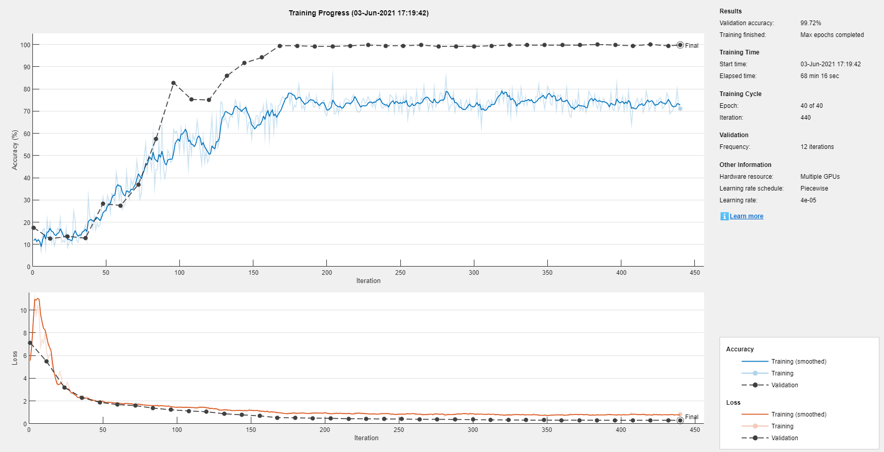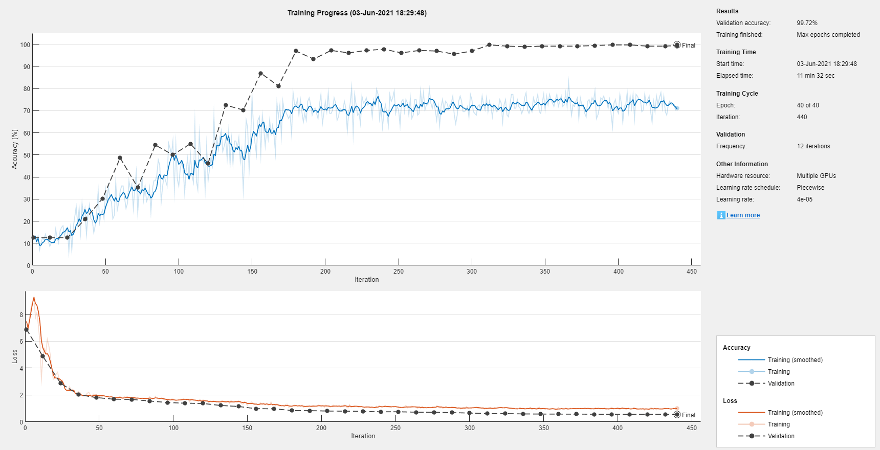 Замените данные о валидации в опциях обучения с основанным на графическом процессоре трубопроводом. Обучите сеть с помощью графического процессора (процессоров) для трубопровода извлечения признаков. Средой выполнения для сетевого обучения является ваш графический процессор (процессоры).