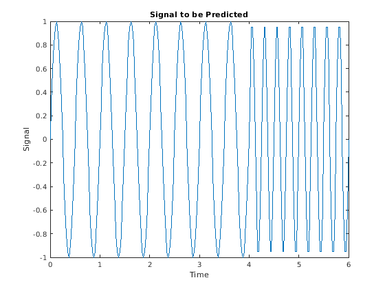 signal = [sin(time1*4*pi) sin(time2*8*pi)]; plot(time,signal) xlabel('Time'); ylabel('Signal'); title('Signal to be Predicted');