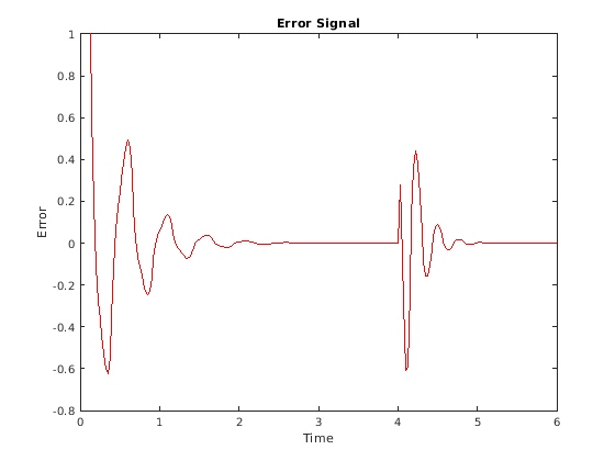 figure E = cell2mat(T)-cell2mat(Y); plot(timex,E,'r') hold off xlabel('Time'); ylabel('Error'); title('Error Signal');