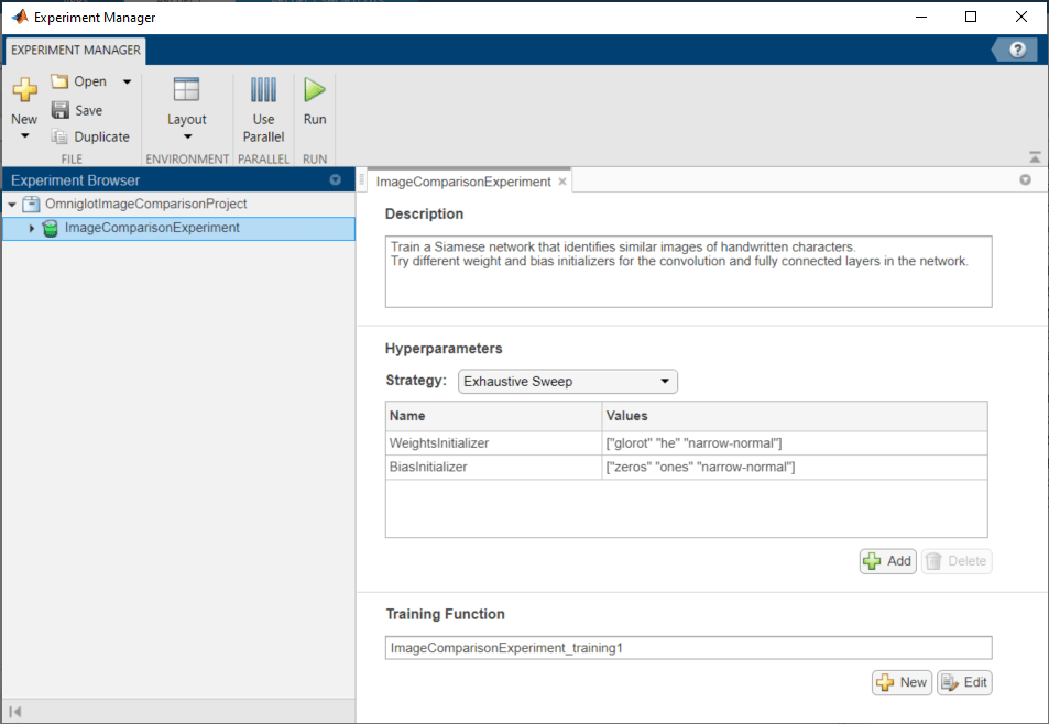 Раздел Hyperparameters задает стратегию (Exhaustive Sweep) и гиперзначения параметров, чтобы использовать для эксперимента. Когда вы запускаете эксперимент, Experiment Manager обучает сеть с помощью каждой комбинации гиперзначений параметров, заданных в гипертаблице параметров. Этот пример использует гиперпараметры WeightsInitializer и BiasInitializer задавать вес и инициализаторы смещения, соответственно, для свертки и полносвязных слоев в каждой подсети. Для получения дополнительной информации об этих инициализаторах, смотрите WeightsInitializer и BiasInitializer.