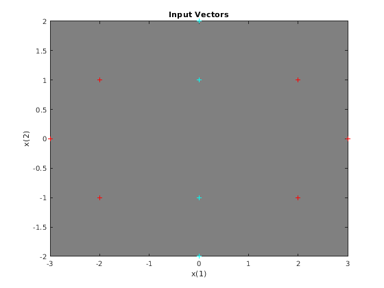 colormap(hsv); plotvec(x,c) title('Input Vectors'); xlabel('x(1)'); ylabel('x(2)');