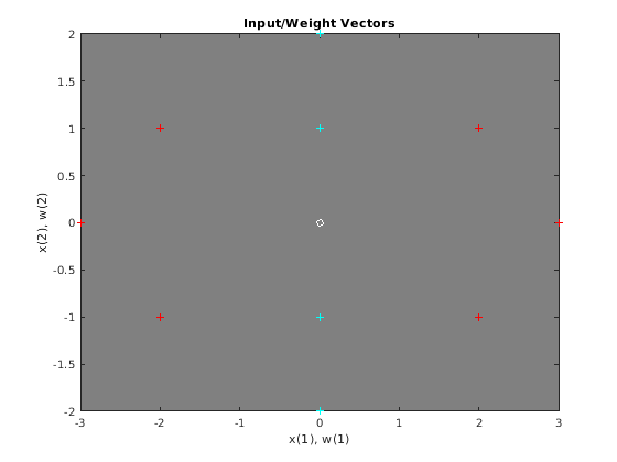 hold on w1 = net.IW{1}; plot(w1(1,1),w1(1,2),'ow') title('Input/Weight Vectors'); xlabel('x(1), w(1)'); ylabel('x(2), w(2)');