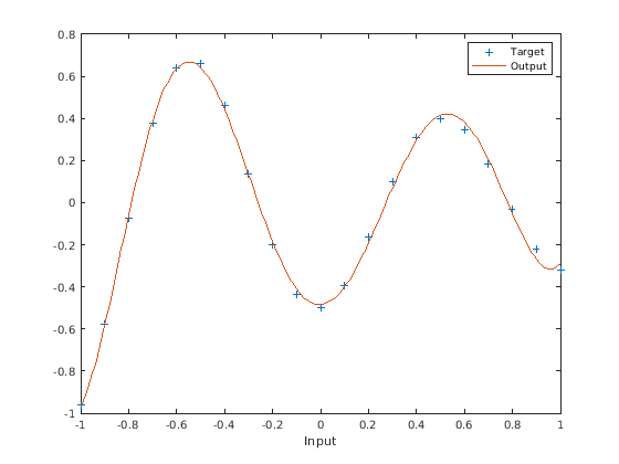 plot(X,T,'+'); xlabel('Input'); X = -1:.01:1; Y = net(X); hold on; plot(X,Y); hold off; legend({'Target','Output'})