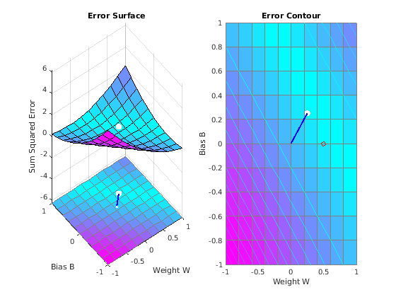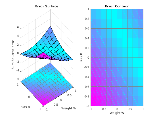 ERRSURF вычисляет ошибки для y нейрона с y областью значений возможного веса и значений смещения. PLOTES строит эту ошибочную поверхность с y контурным графиком внизу. Дно долины на ошибочной поверхности соответствует бесконечным решениям этой проблемы.