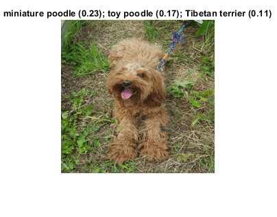 [YPred,scores] = classify(net,imgLaikaGrass); [~,topIdx] = maxk(scores, 3); topScores = scores(topIdx); topClasses = classes(topIdx); imshow(imgLaikaGrass) titleString = compose("%s (%.2f)",topClasses,topScores'); title(sprintf(join(titleString, "; ")));