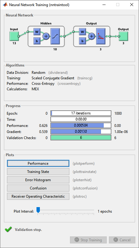 Инструмент Обучения Нейронной сети показывает обученную сеть, и алгоритмы раньше обучали его. Это также отображает учебное состояние во время обучения и критериев, которые остановились, обучение будет подсвечено в зеленом.
