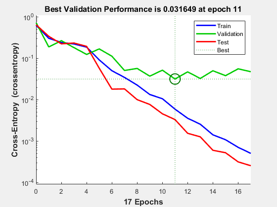 Теперь сеть готова быть обученной. Выборки автоматически разделены на обучение, валидацию и наборы тестов. Набор обучающих данных используется, чтобы преподавать сеть. Обучение продолжается, пока сеть продолжает изменять к лучшему набор валидации. Набор тестов обеспечивает абсолютно независимую меру сетевой точности.